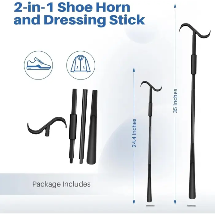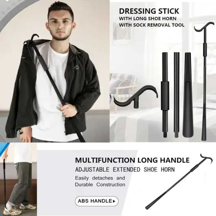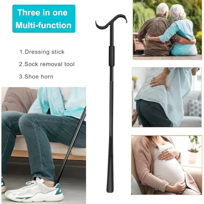 • Multifunctional NHS Healthcare – This versatile dressing stick combines a shoe horn, sock remover, and extended reach assist tool. The shoe horn end helps slide feet into shoes, boots, or slippers without bending, while the opposite end features hooks to assist with putting on socks, shoes, pants, and shirts, making dressing easier from head to toe.