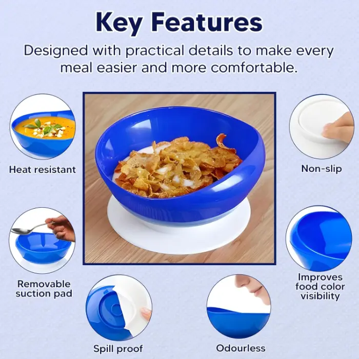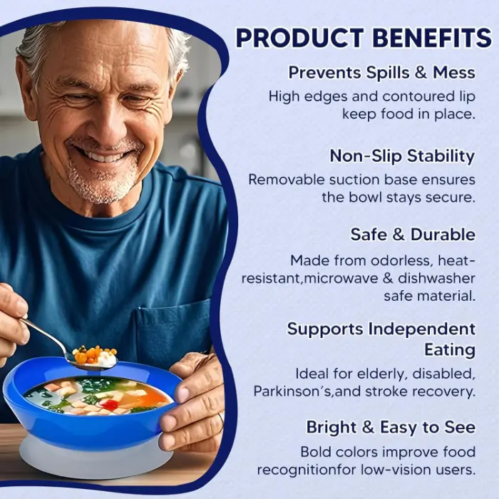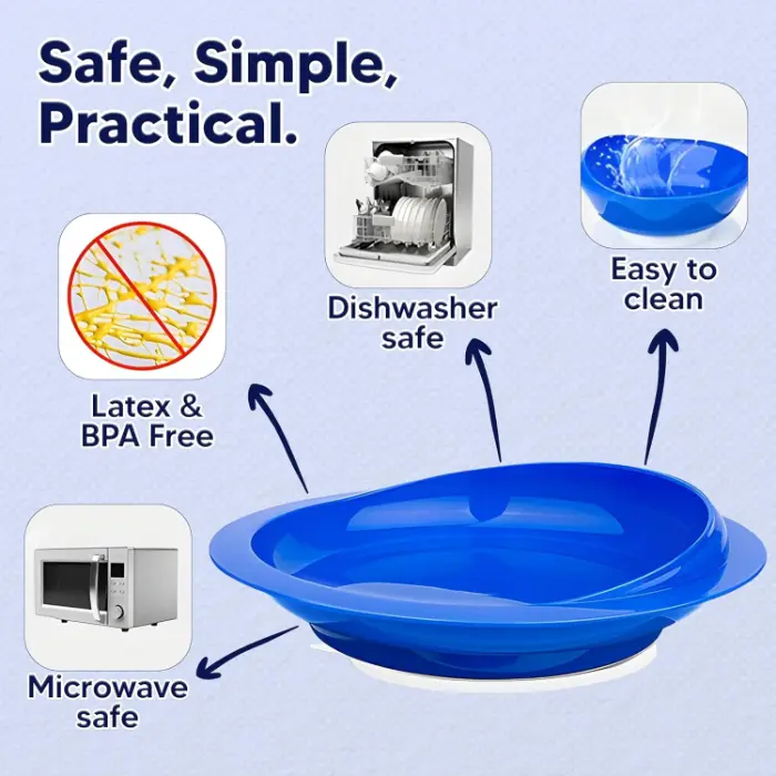 This large scoop plate features a secure suction base to prevent movement during meals. Designed to support independent eating, the raised edges help reduce spills and make scooping food easier, making it ideal for elderly users, individuals with limited mobility, or coordination challenges.